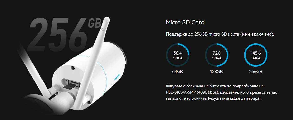 Тази интелигентна IP камера поддържа 24/7 непрекъснат запис, задействане на запис при движение или запис по график. Видеоклиповете от всичките тези 3 вида запис могат да бъдат записани в micro SD карта, Reolink NVR или FTP сървър. Изберете начин, който харесвате, и се насладете на лесна и персонализирана сигурност.